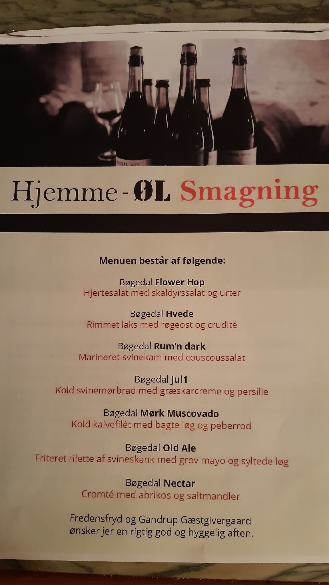 I går var et par af de lokale aktører gået sammen om at lave en Hjemme-Øl smagning. Det var Gæstgivergaarden i Gandrup, der havde sammensat en tapastallerken med 7 lækre retter. Til denne menu havde Fredensfryd udvalgt 7 øl fra Bøgedal til at supplere oplevelsen. Fredensfryd er en ny gårdbutik, der ligger på Aslundvej lige udenfor Vester Hassing. Jeg må med skam berette, at jeg ikke kendte til den tidligere, men min kone gjorde dog. Jeg må vist lige kigge indenfor engang.